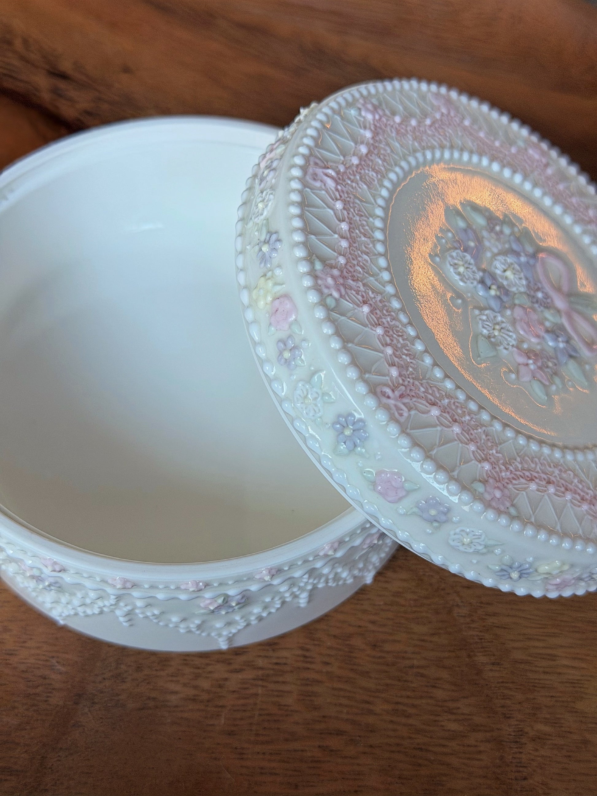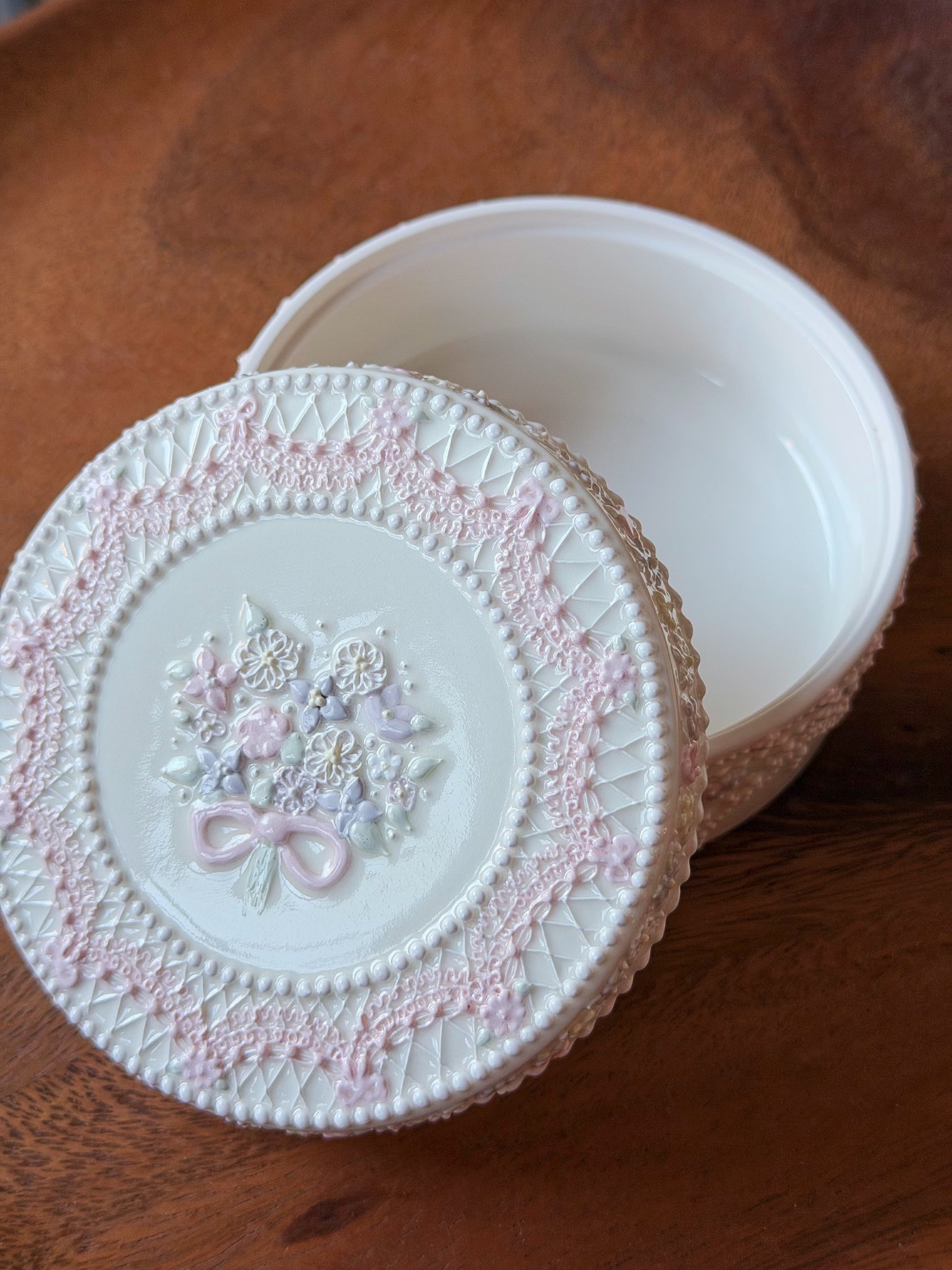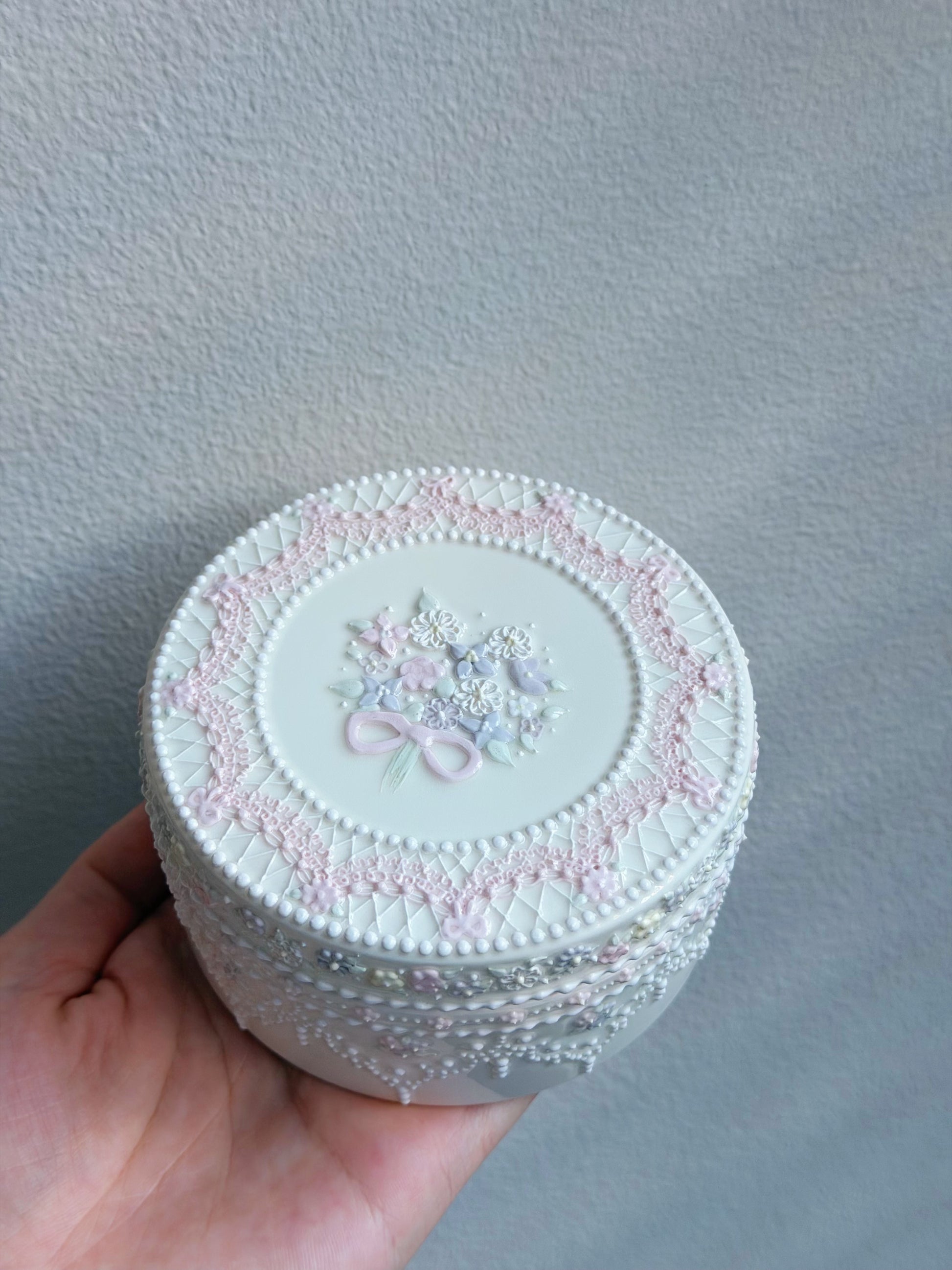 Una pequeña caja de cerámica decorada con delicados detalles de encaje y pequeñas flores pastel. Tiene un delicado toque vintage, perfecto para guardar pequeños tesoros como joyas, horquillas o pequeños objetos con valor sentimental. Una pieza bonita y relajante que aporta un toque de encanto a cualquier rincón de tu hogar.