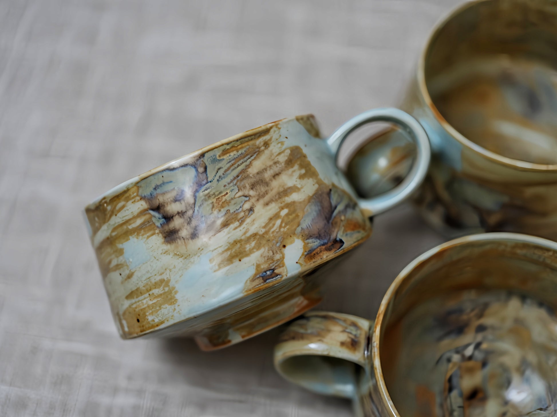 Des nuances de vert profond et de tons terreux se fondent naturellement à la surface, créant un motif unique sur chaque pièce. Chaque tasse est unique, à l'image des aurores boréales.