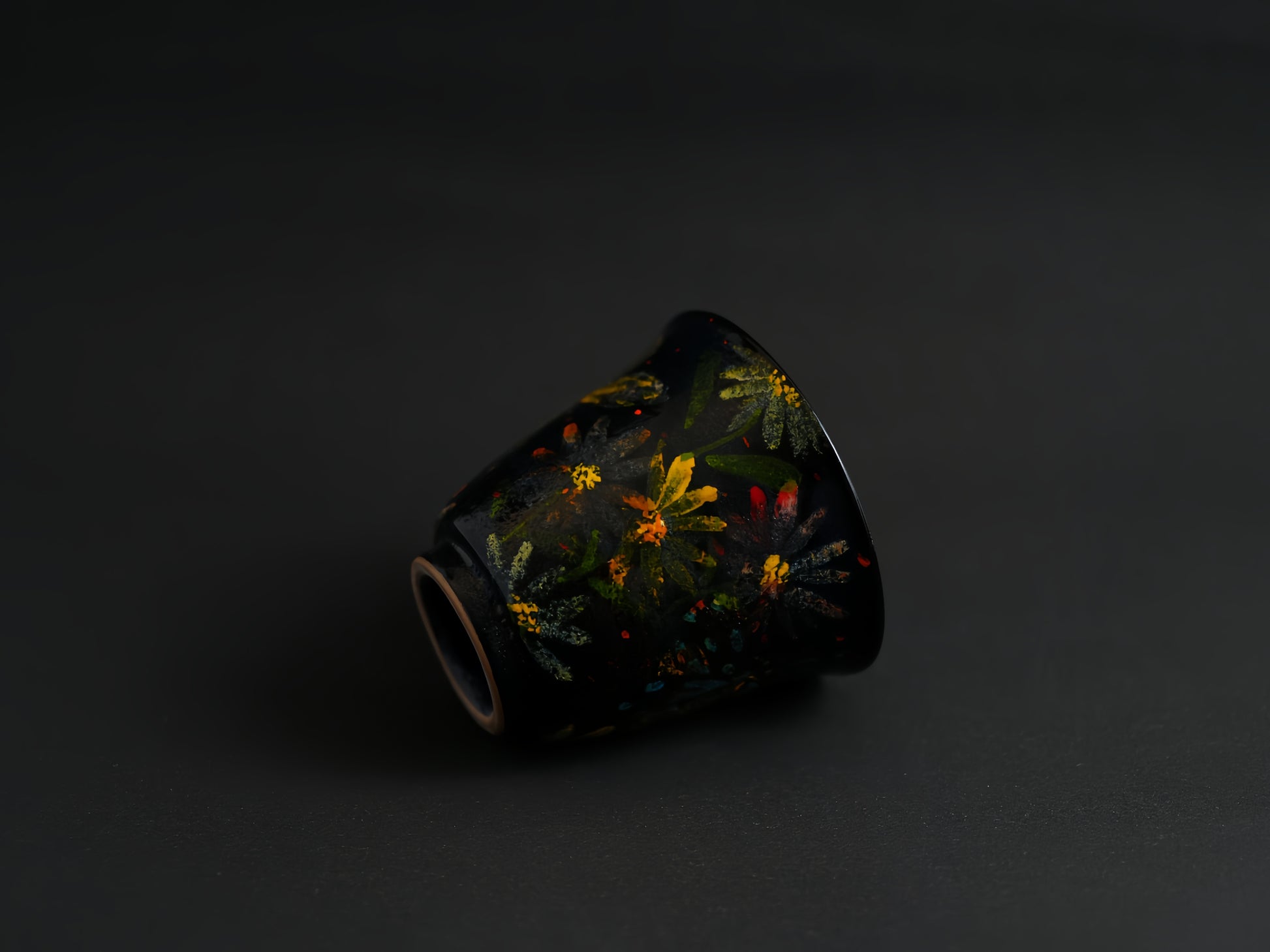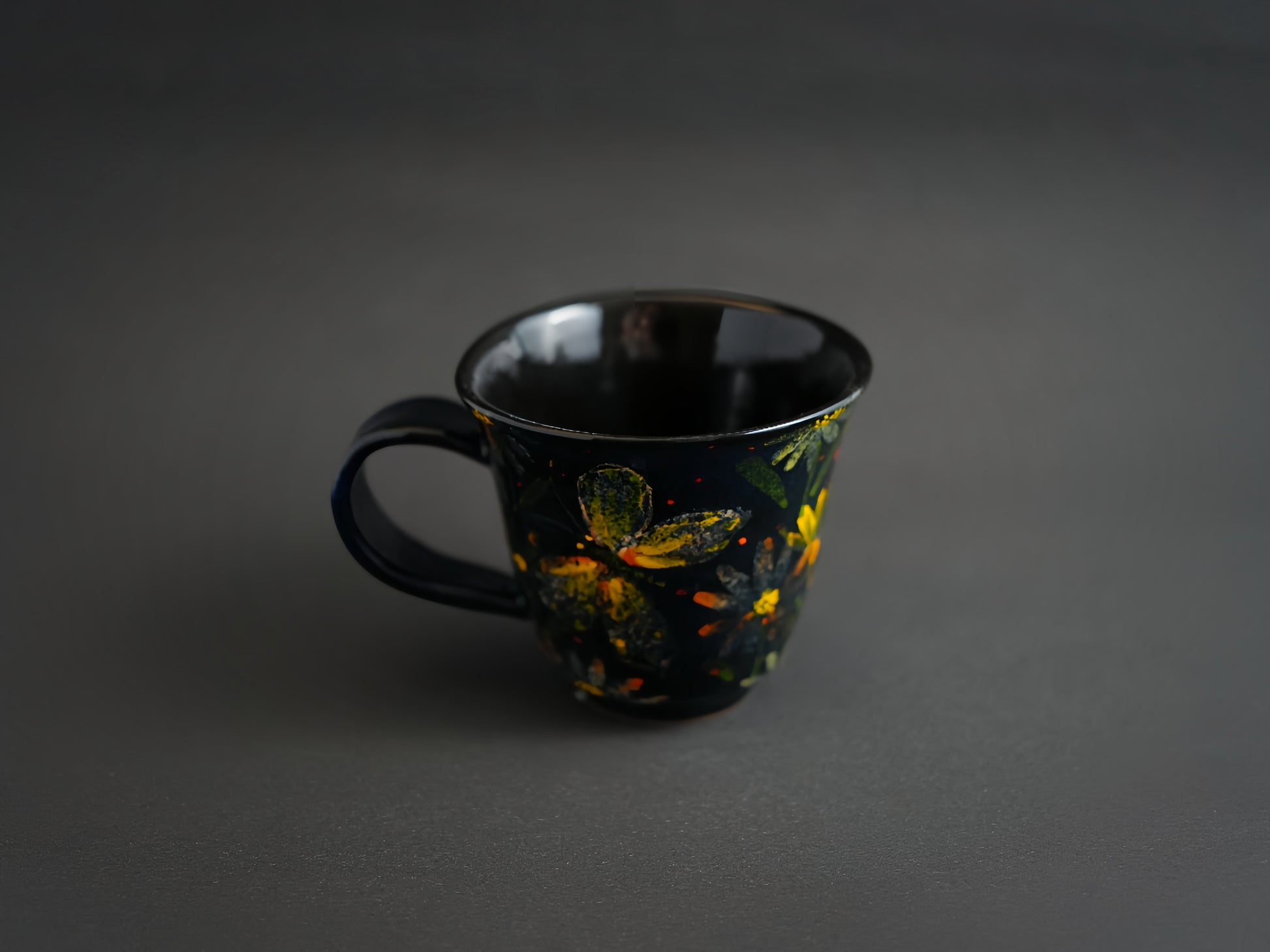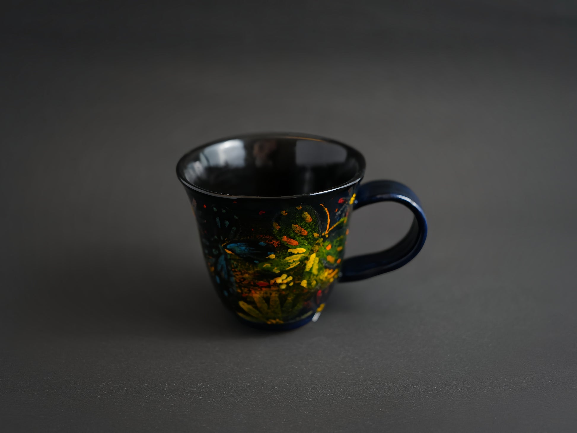 A hand-painted ceramic mug with bright floral details on a deep, glossy base. The soft, wavy rim and easy to hold handle give it a warm, handmade feel. It’s a cheerful little piece that adds a bit of color and charm to your everyday sipping.