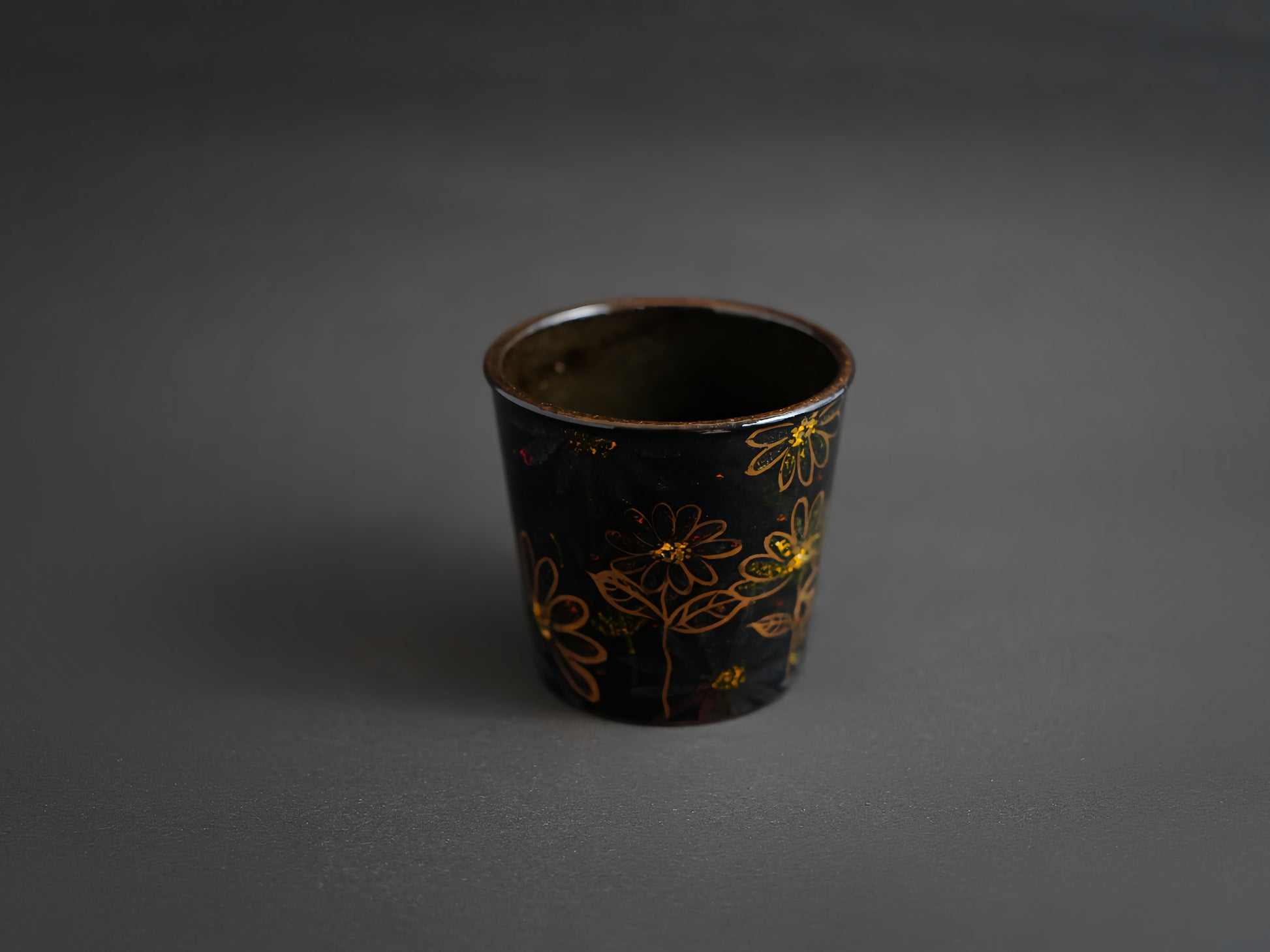 A hand-painted ceramic cup with a deep black base and delicate floral lines highlighted with touches of gold. Its smooth, handleless form gives it a simple, easy feel in the hand, while the gold details add a subtle sparkle. A small, elegant piece that brings a bit of charm into everyday moments.