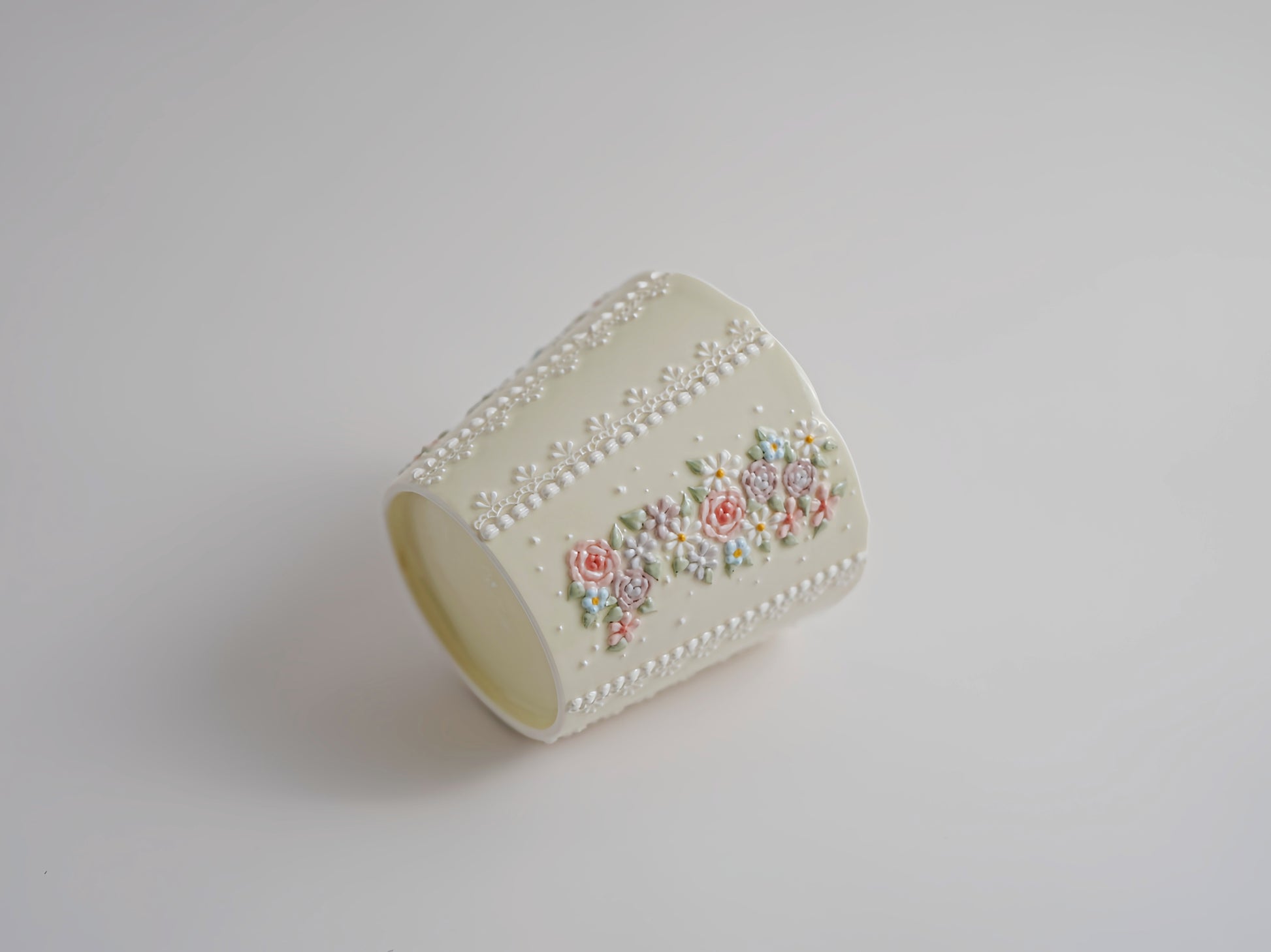 This ceramic mug with delicate raised floral details all around. The shape is simple and easy to hold, making it great for everyday drinks from coffee in the morning to tea at night. A calm, pretty mug that quietly fits into your daily routine.