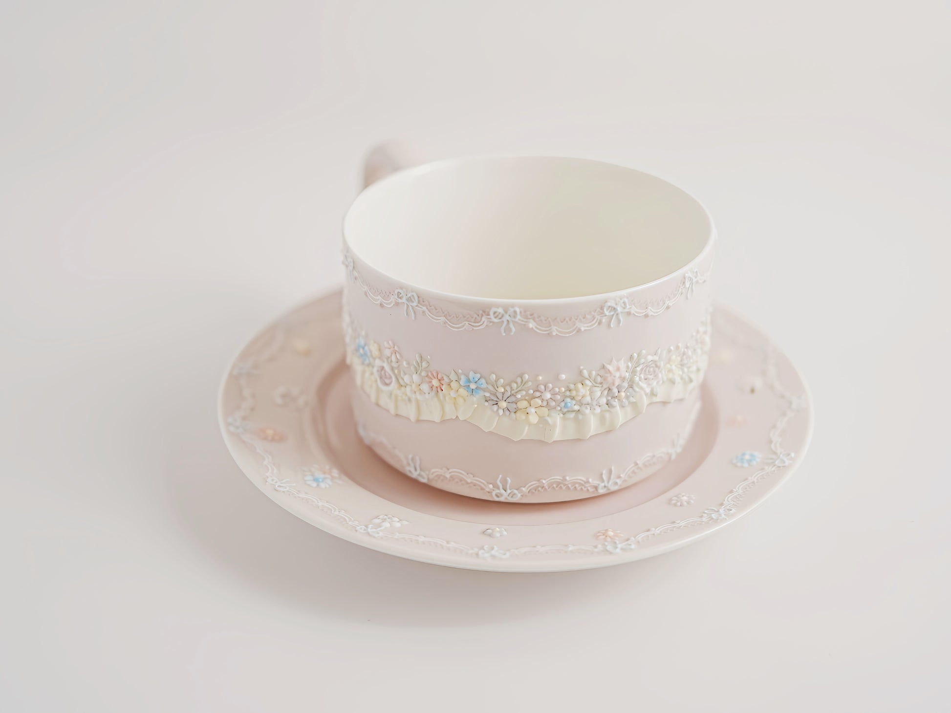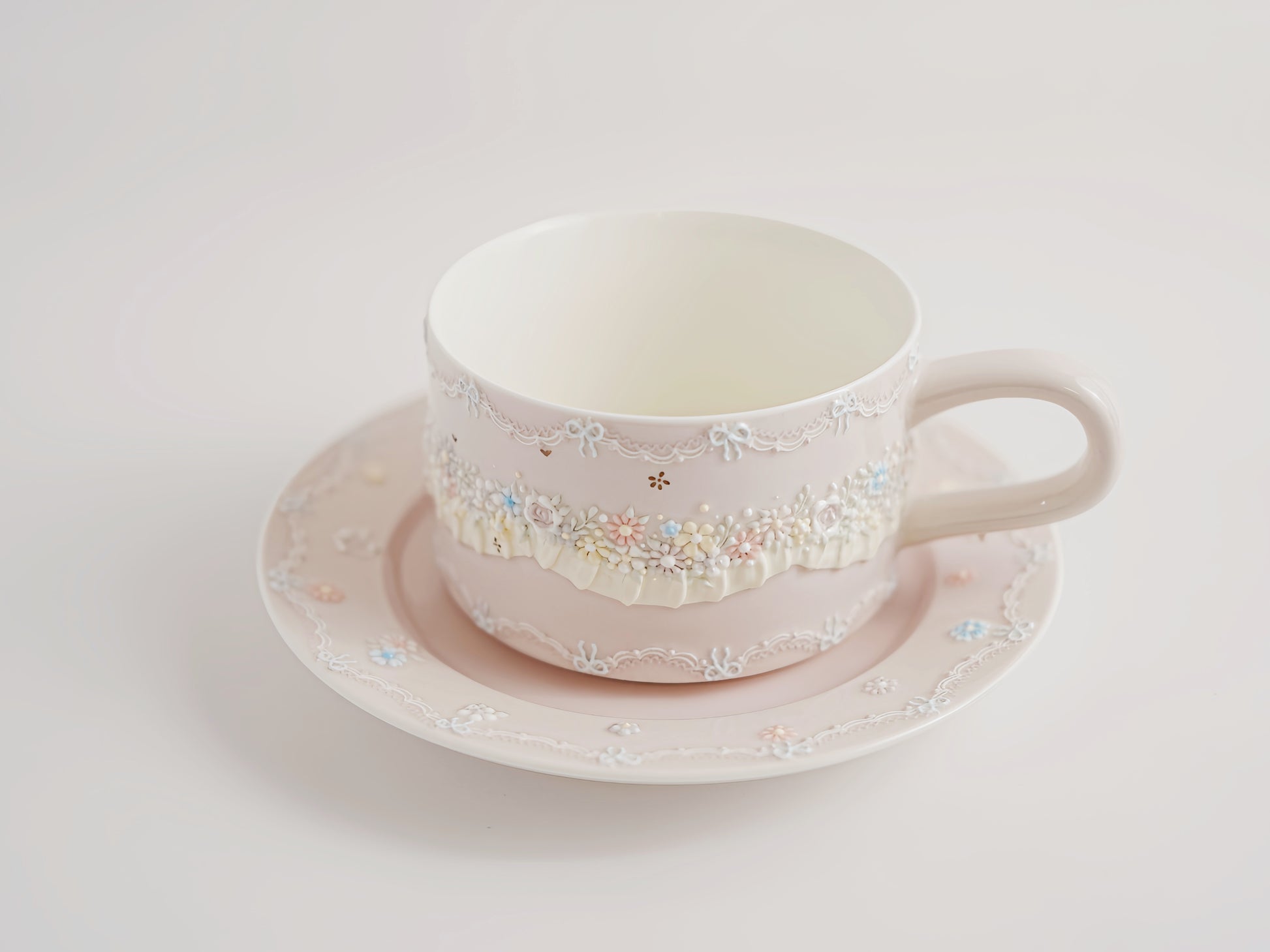 A soft pastel ceramic cup set decorated withraised flowers, lace like details, and gentle ruffled textures. The light, creamy color and smooth shape give it a sweet, calming feel perfect for slow morning coffees or cozy afternoon tea. A lovely little set that adds a touch of softness and charm to your everyday routine.