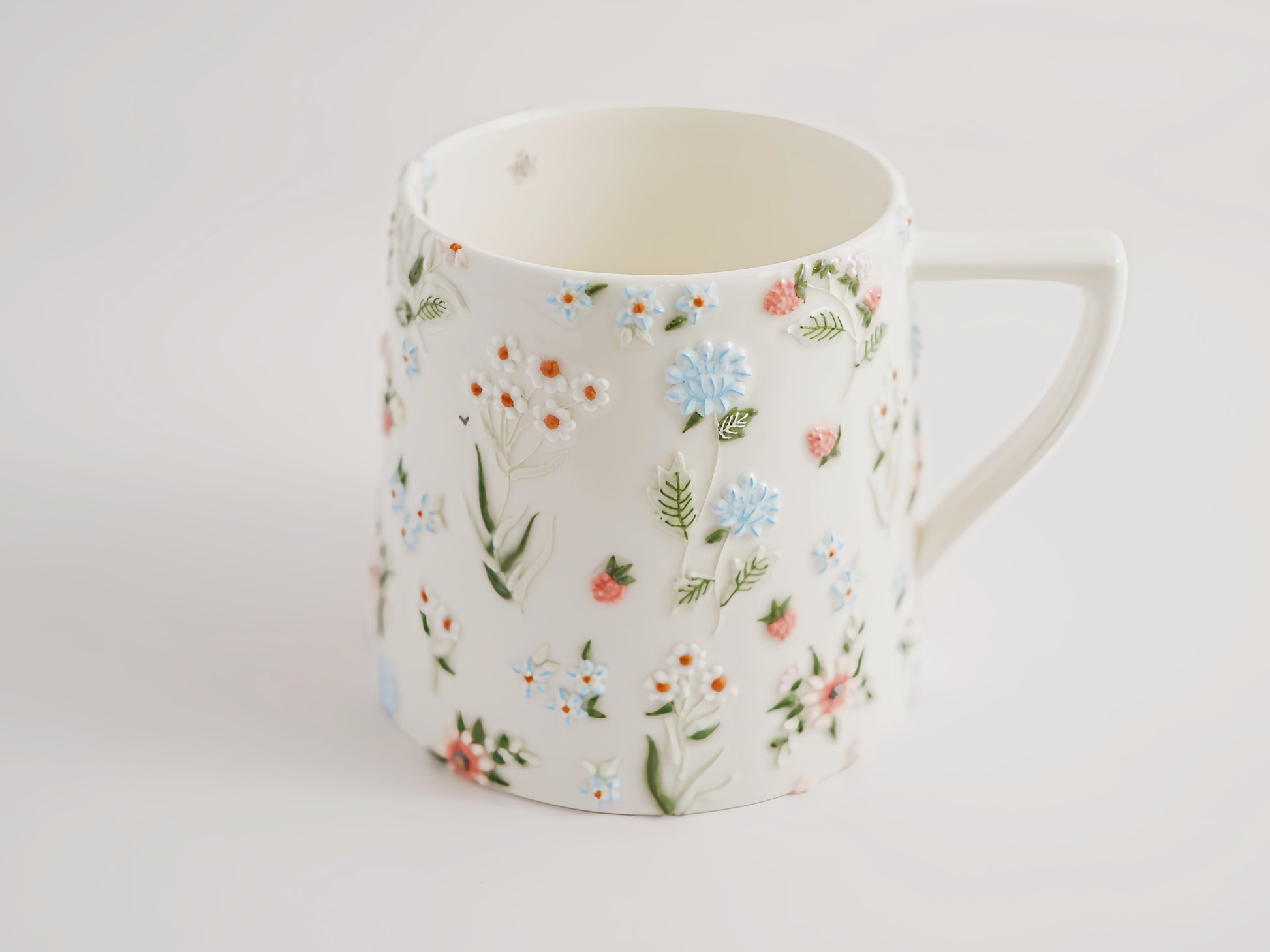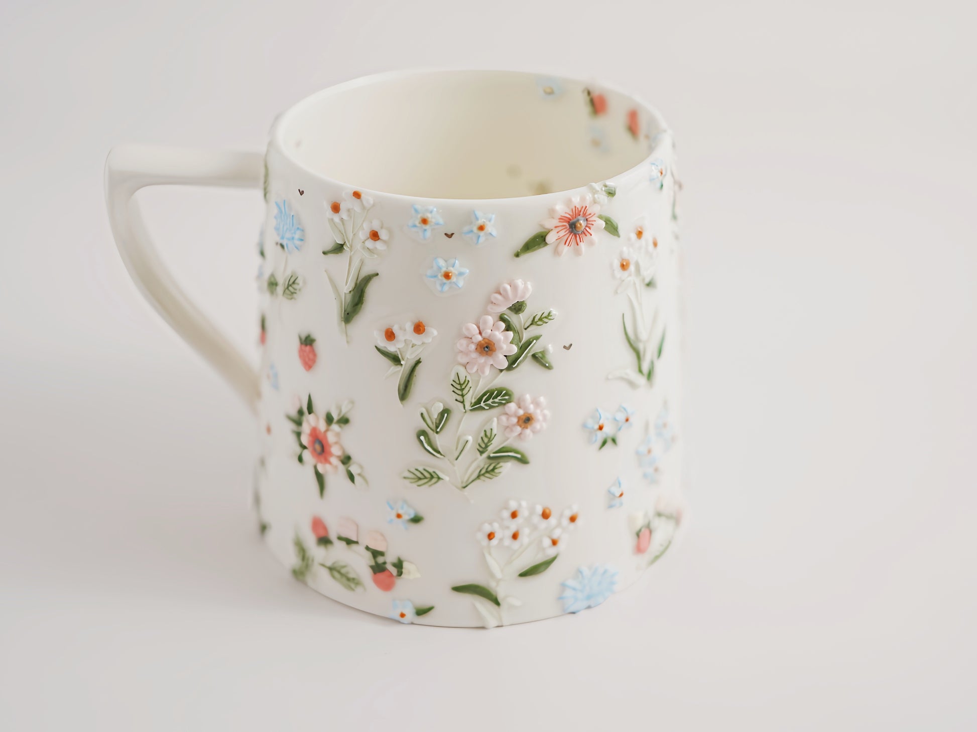 A ceramic mug covered in tiny hand-crafted flowers in soft pastel tones.